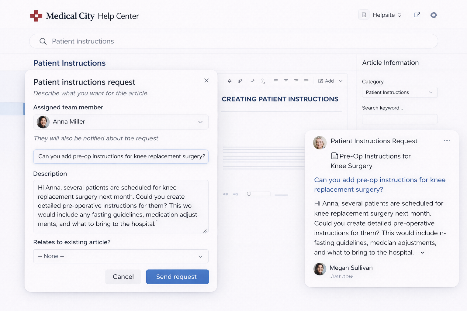 For example, a searchable help center can surface relevant instructions as soon as a patient begins typing. Fast search dramatically improves self-service adoption and reduces support requests.